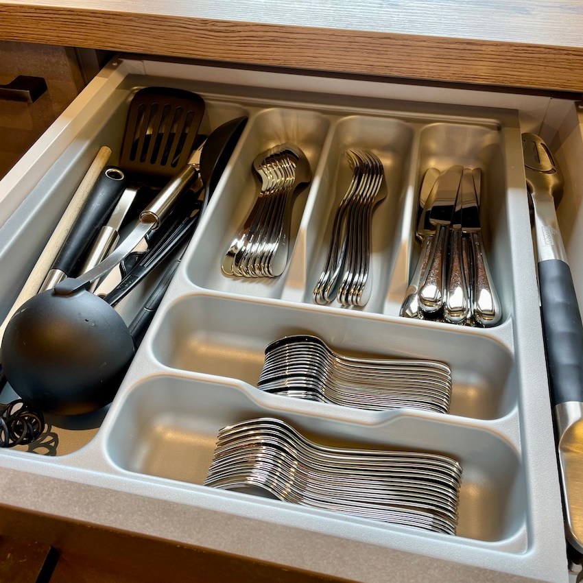 Alles da: Kühlschrank, Gefrierschrank, Geschirrspüler, Herd mit Cerankochfeld und Backofen, Mikrowelle, Kaffeeautomat mit Bohnen, Wassersprudler, Geschirr, Gläser und Besteck von WMF, …