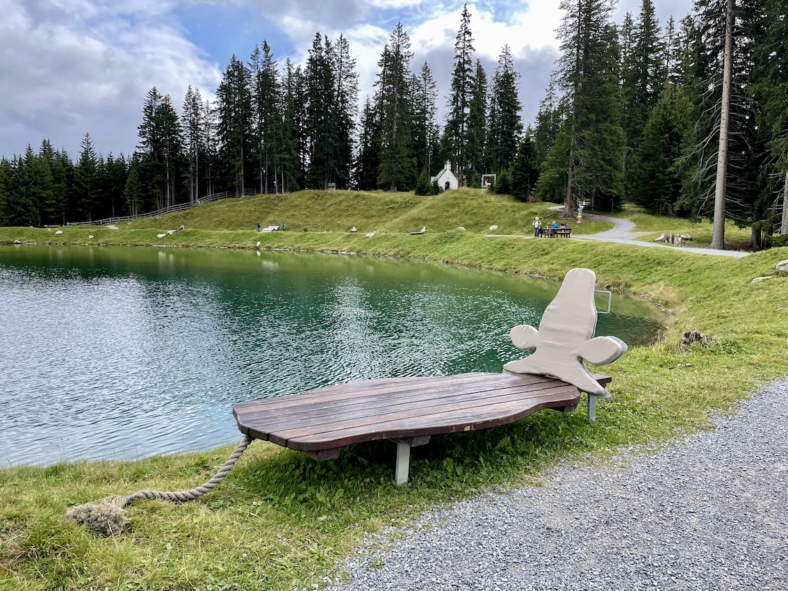 Riesenmilchkannen, Kuhfladentrampolin, Holzkugelbahn, Milchkannen-Memory, echte Ziegen, … warten auf die kleinen Urlaubsgäste. Viele abwechslungsreiche und kreative Spielstationen sind um den kleinen See aufgereiht.