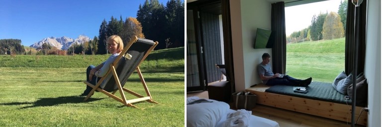 Den Liegestuhl und das bequeme Daybed mit herrlichem Blick in die Berge haben wir gleich zu unseren Lieblingsplätzen erklärt. Nur eine kuschelige Decke hat noch zu unserem Glück gefehlt, aber die haben wir schnell über die Rezeption erhalten.