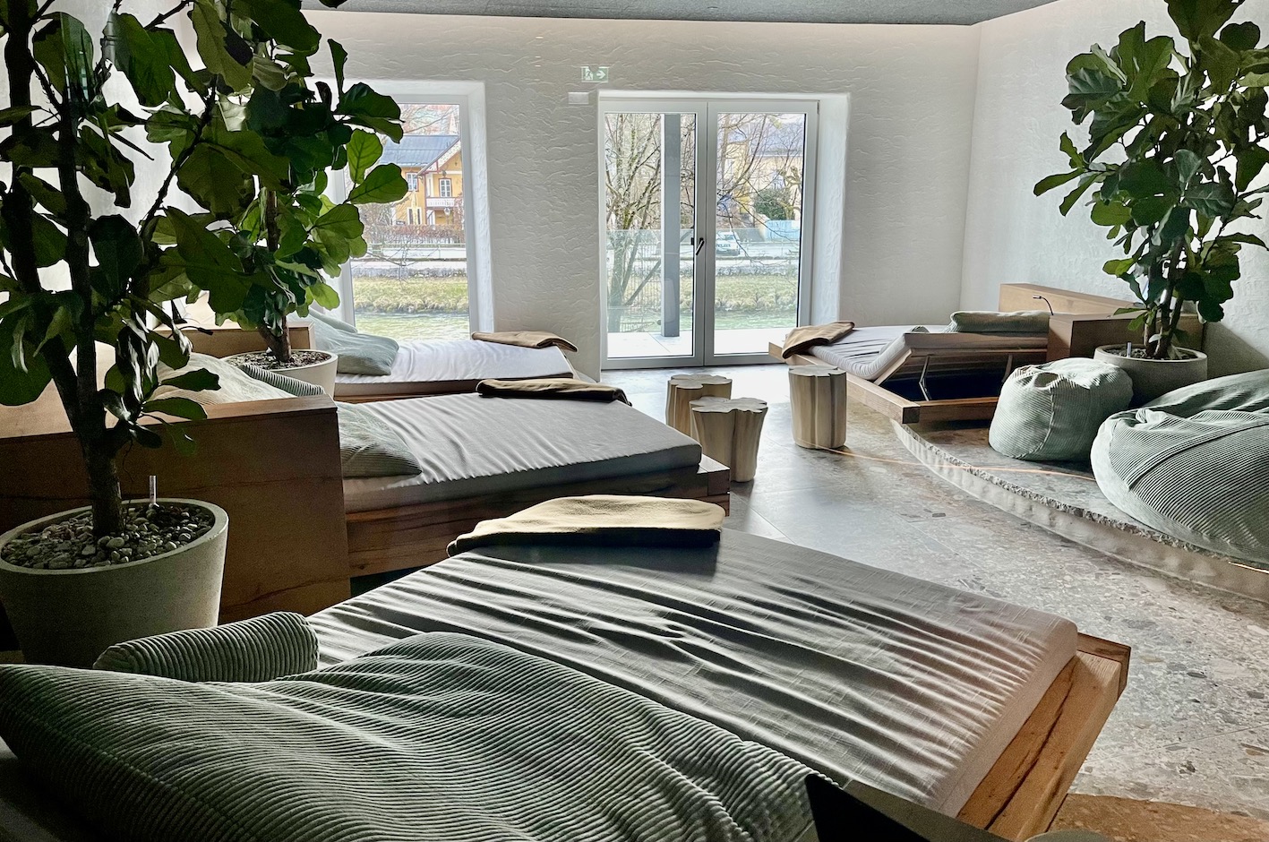 Die einladenden Indoor-Ruheräume haben einen wunderschönen Blick auf die grüne Traun.