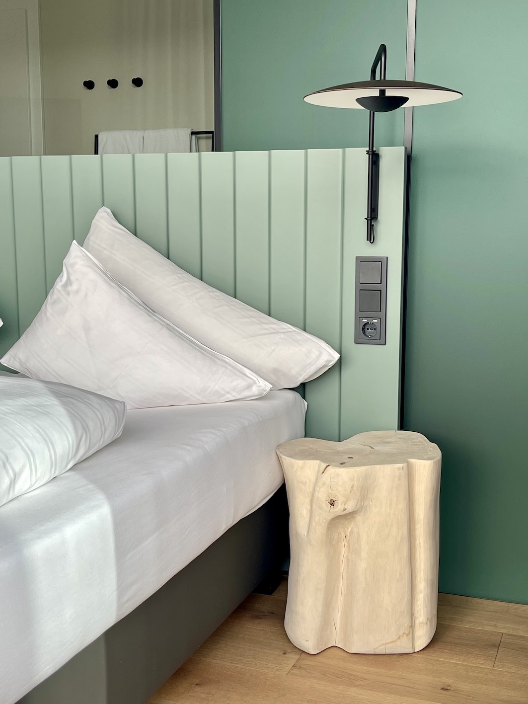 Alles ist stimmig und sehr durchdacht. Es gibt genügend Ablageflächen und viele Steckdosen. Sogar ein Bewegungsmelder ist unter dem Bett verbaut, der ein Nachtlicht anknipst, wenn du im Dunkeln einen Fuss neben das Bett setzt. Klasse.