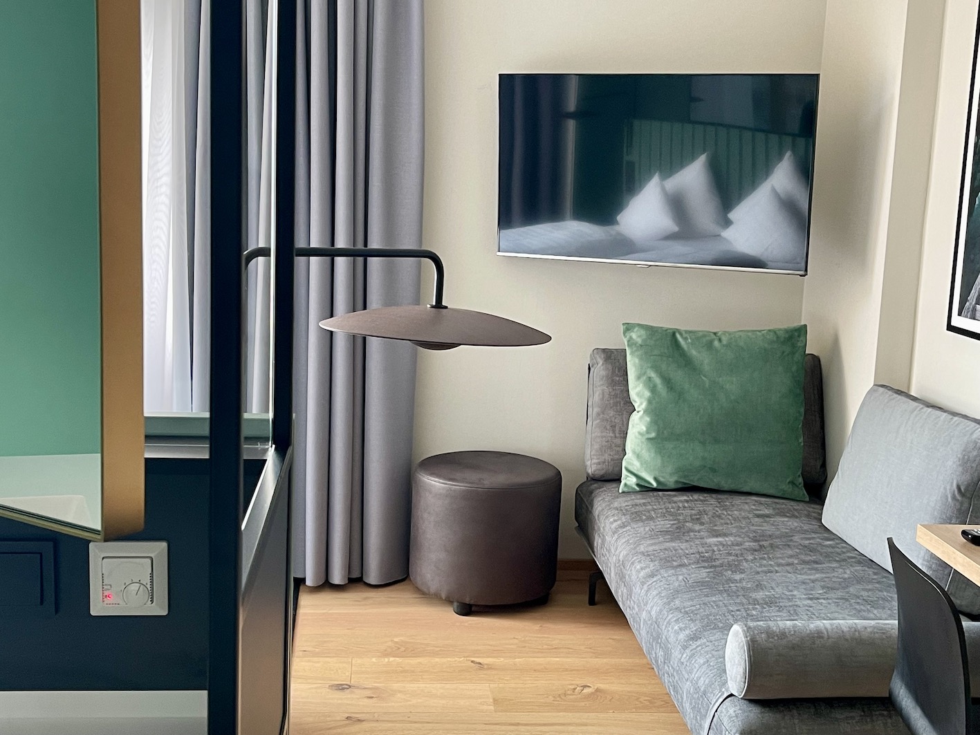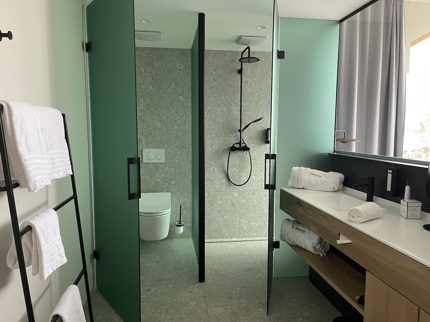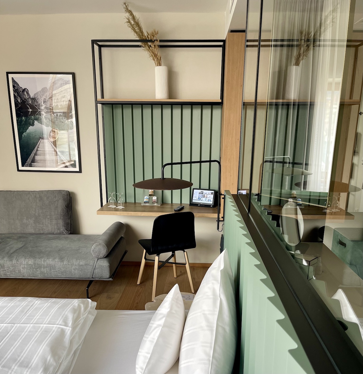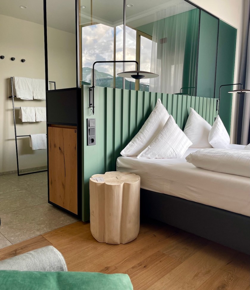 Kuscheliger Bademantel, Fussbodenheizung, japanisches hightech Dusch-WC, großzügige, Regendusche – Minibar, Safe, Fernseher – alles da, was moderne Traunreiter lieben. Ergänzen würden wir im Zimmer nur noch eine Glaskaraffe für das hauseigene Granderwasser.