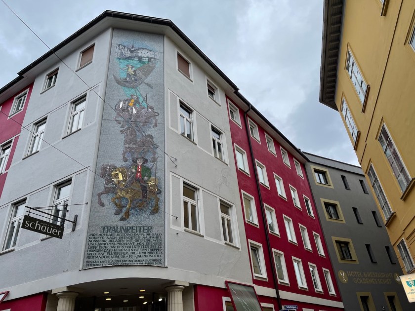 Auch an der Haus-Fassade wird die Geschichte der Traunreiter in einem großen Mosaik dargestellt.