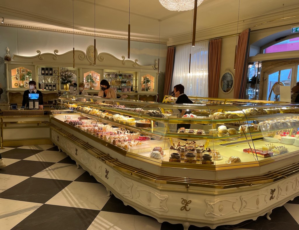 Von hier hast du den direkten Blick auf das Grand Cafe der bekannten Bad Ischler Konditorei Zauner, ehemalige k.u.k. Hofzuckerbäcker und Hoflieferanten, in der Pfarrgasse.