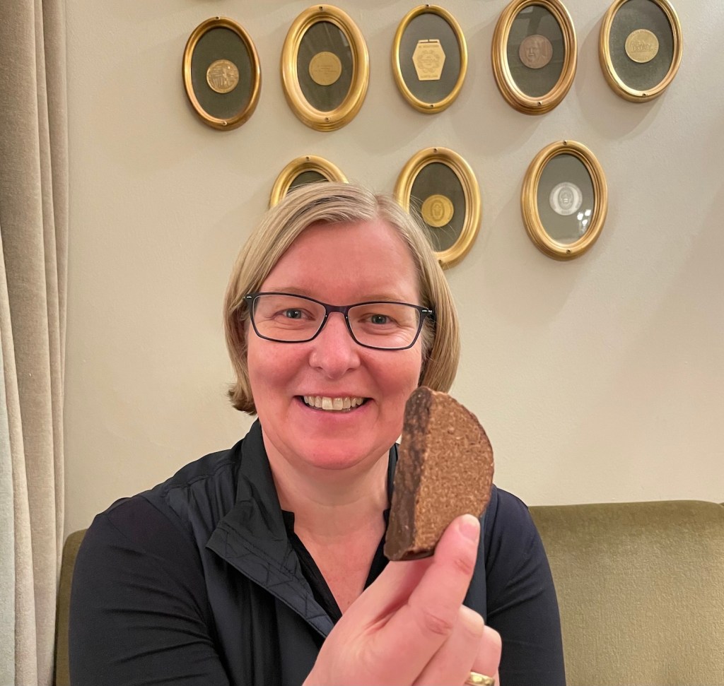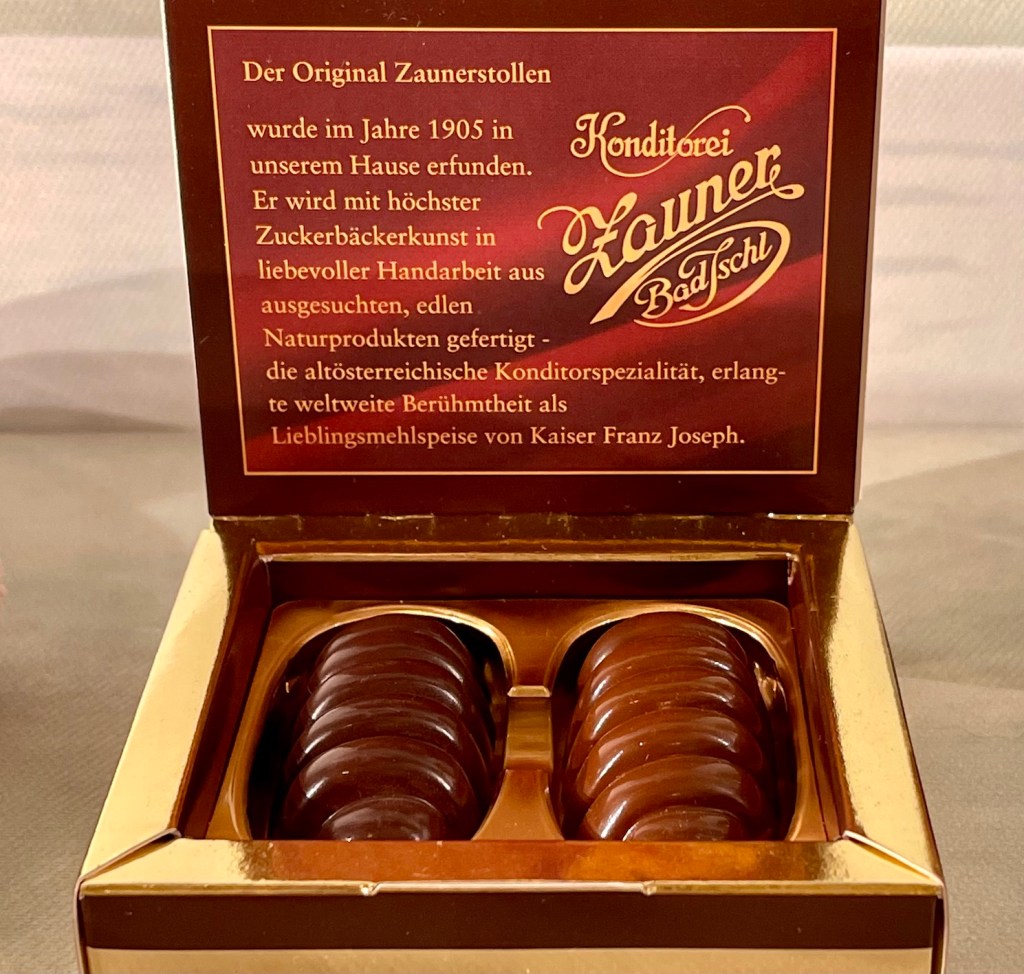 Für den Zaunerstollen werden die Ischler Oblaten zerkleinert, mit einer nougatartigen Haselnuss-Schokoladen-Masse vermischt und mit Schokolade überzogen. Verkauft wird er in Scheiben oder als ganzer Stollen in verschiedenen Größen. Also ein Muss auf der GenussTour.