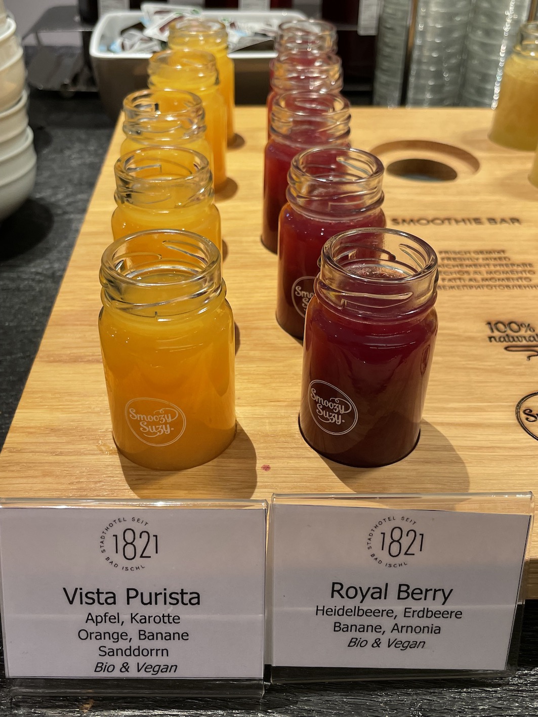 Besonders angetan hat es uns der frisch gepresste Orangensaft direkt aus der Orangenpresse. Auch die Smoothie-Bar ist ein Hingucker mit den kleinen Fläschchen.