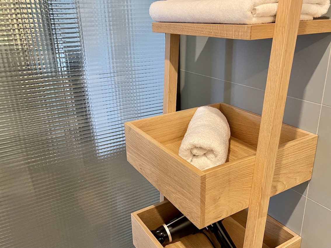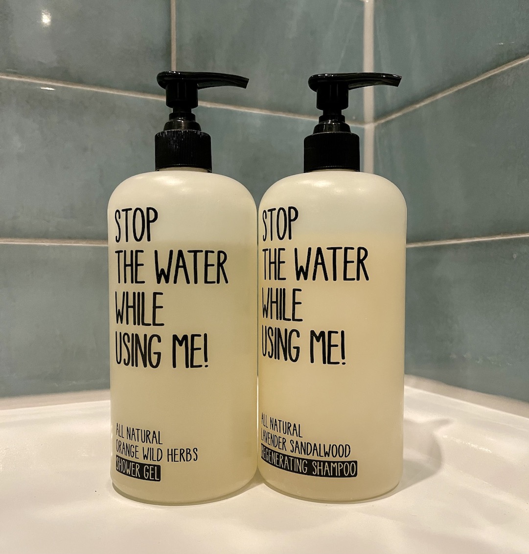 Große Regendusche mit Produkten von „Stop the water while using me“. Flauschige Handtücher und ein Fön liegen bereit.