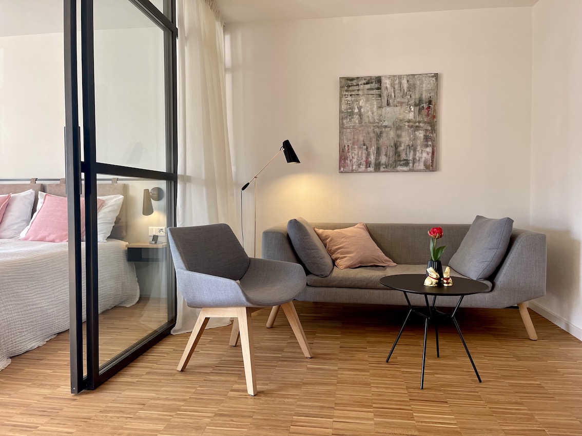 Weite. Ruhe. Licht. Dieser Einblick soll euch zeigen, wie luftig alles ist und wie viel Platz ihr in dem 62 Quadratmeter großem Quartier zur Verfügung habt. Die schwarzen Glas-Schiebeelemente teilen das Quartier großzügig in verschiedene Bereiche.