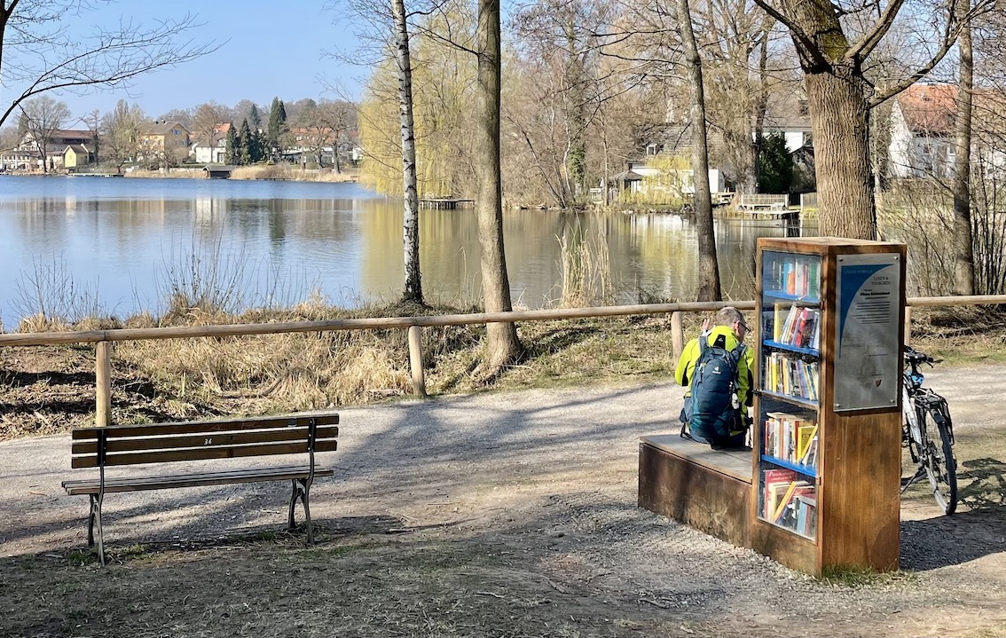 Immer mit spannenden Ausblicken. Los gehts am offenen Bücherschrank, weiter zur Oase am See, dem gemütlichen Kiosk Wasserberghäusl mit eigenem Steg und vielen Liegestühlen. Von hier soll der Sonnenuntergang besonders schön sein.