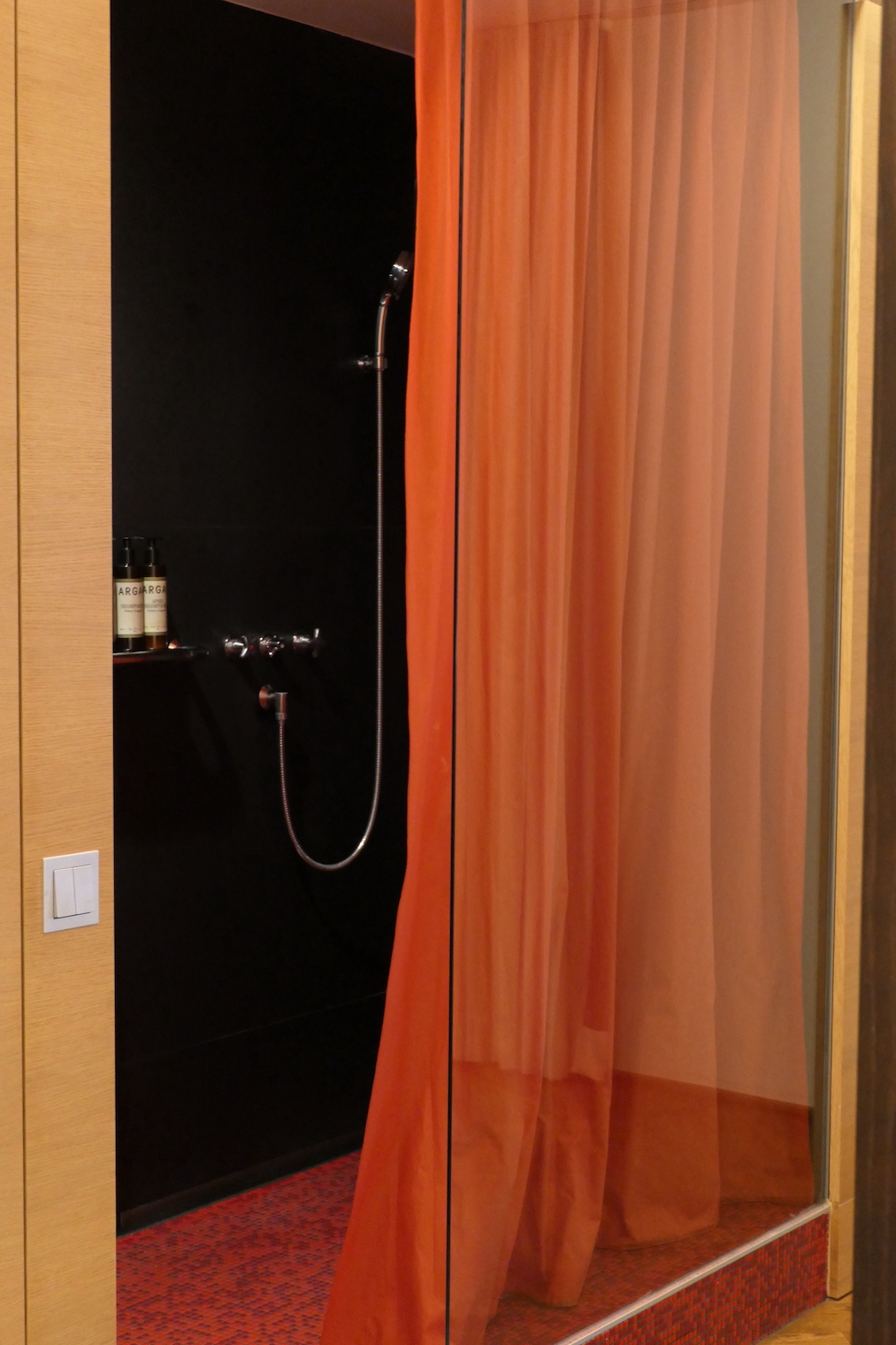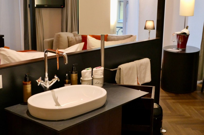 Schreibtisch, Sofa, Minibar alles sehr hochwertig und stimmig. Die Farbakzente in orange runden den ersten Eindruck harmonisch ab. Ein richtiges Wohlfühlzimmer mitten in der Stadt.