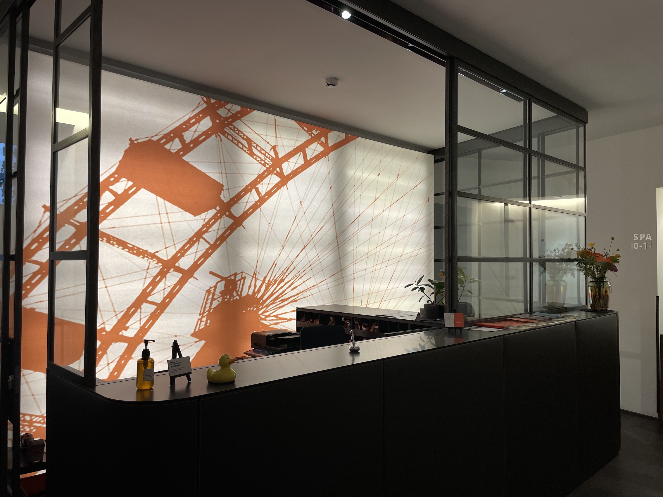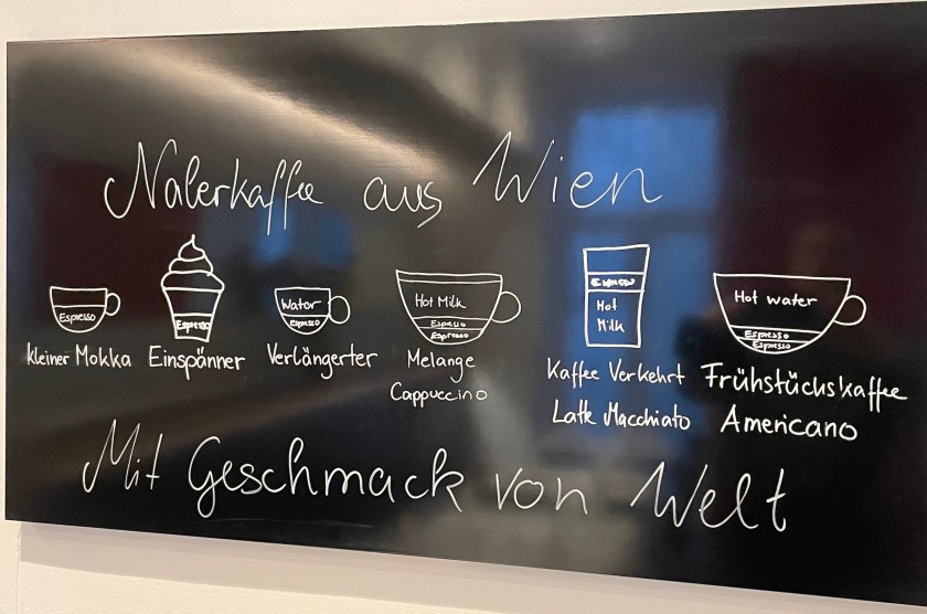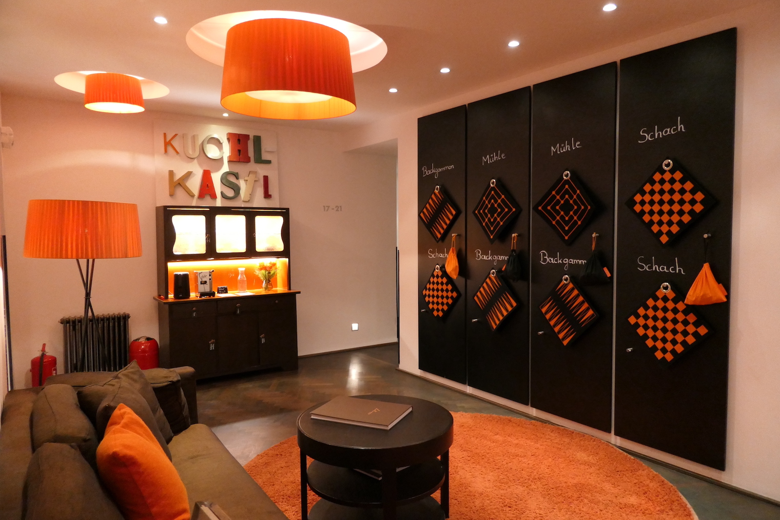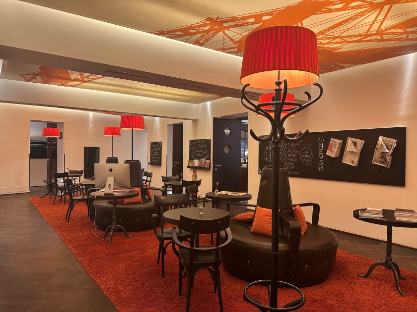 In entspannter Atmosphäre genießen wir nach dem Einchecken hier einen kleinen Mokka bzw. eine Wiener Melange und lassen den Raum mit dem Wiener Riesenrad an der Decke auf uns wirken. Orange ist unübersehbar die Hausfarbe.