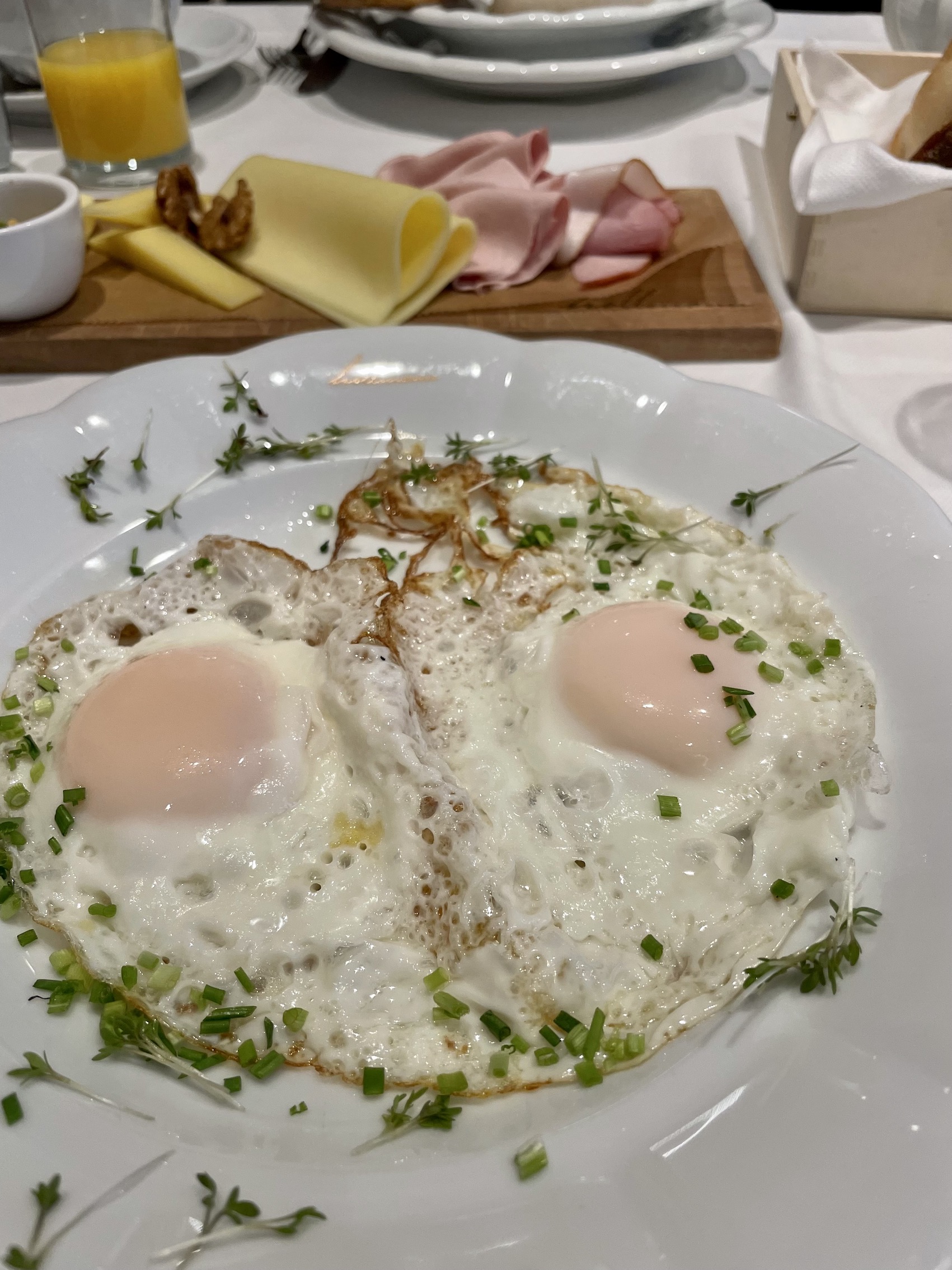 Es gibt aber auch Spiegelei, Omelett oder ein weiches Frühstücksei.