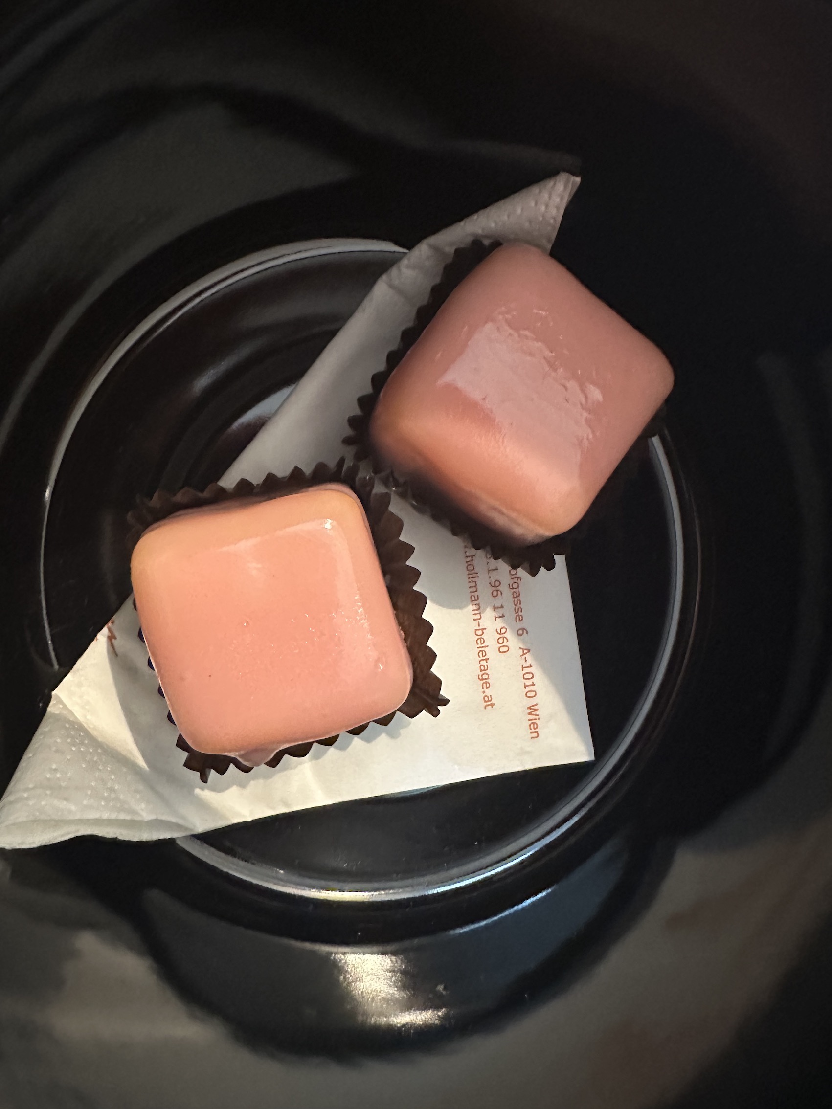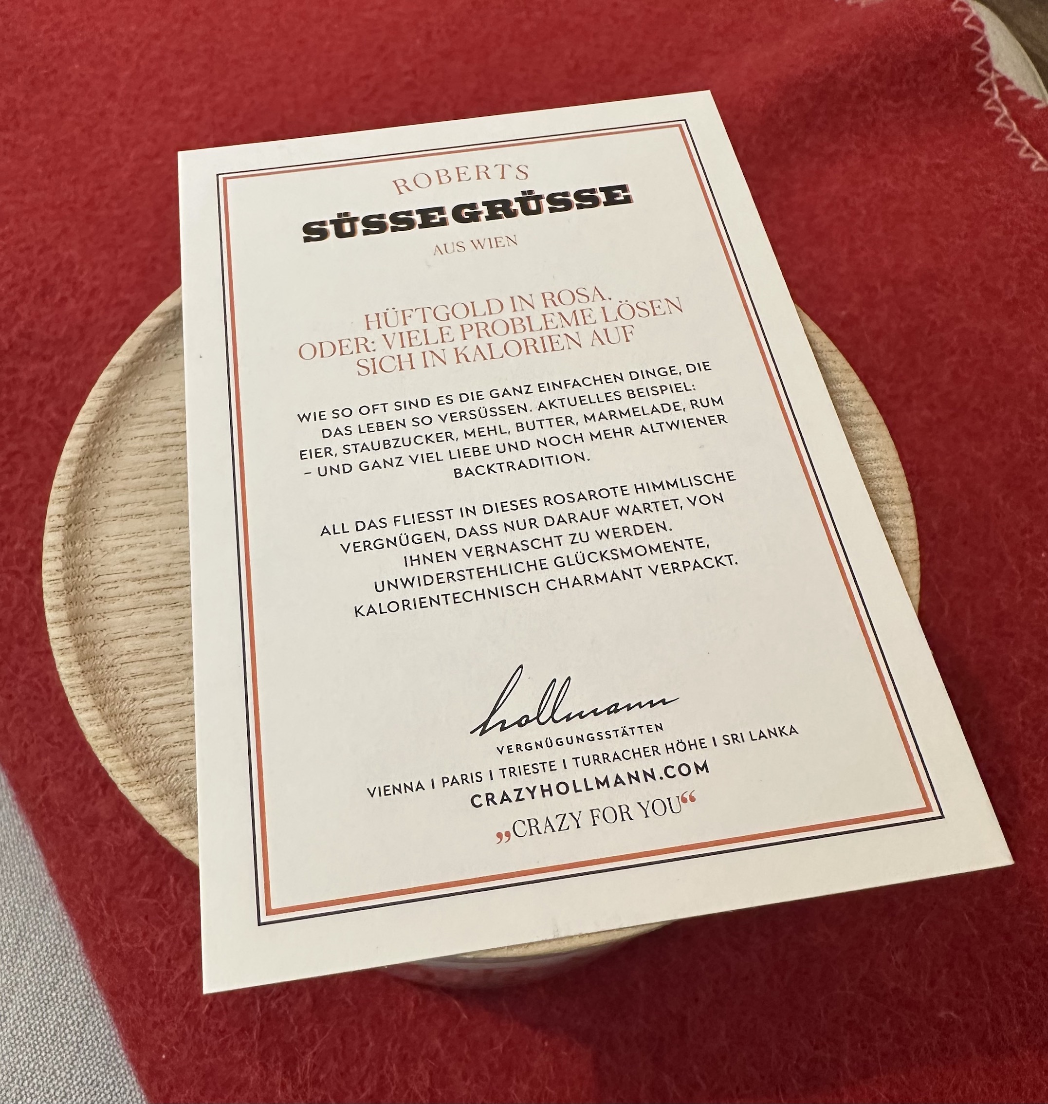 Altwiener Backtradition von K.u.K. Hofzuckerbäcker L. Heiner, Wollzeile. Und hier schließt sich unbewusst der Kreis. Das Team der Hollmann Beletage hat die Punschkrapfen nach Geschmack ausgesucht, ohne zu wissen, dass Robert genau in dieser Hofzuckerbäckerei vor Jahrzehnten eine Lehre zum Konditor gemacht hat. Es folgte noch eine zweite Lehre als Koch, dann widmete sich Robert ganz seiner Schauspielleidenschaft am Burgtheater Wien. Ja, die Welt ist klein und Robert ein Tausendsassa voller Überraschungen. Schade, dass wir ihn nicht persönlich vor Ort getroffen haben. Aber sein tolles Team hat ihn würdig vertreten.
