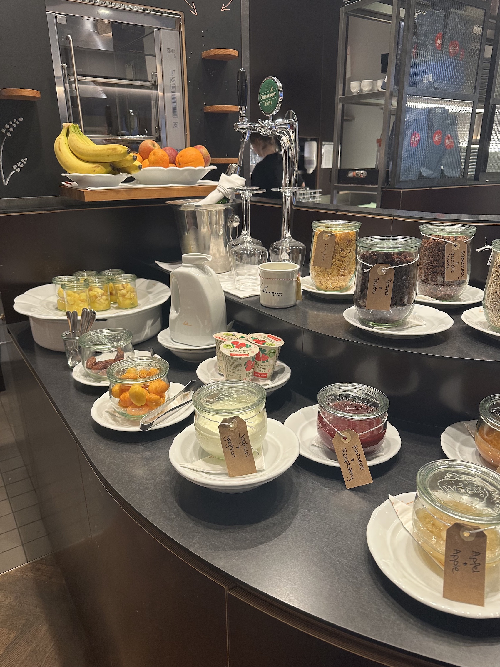 Bei den leckeren Marmeladen, beim Obst und beim Müsli bedient ihr euch selbst, alles andere wird an den Tisch serviert.