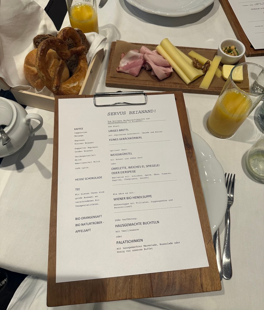 Ihr habt freie Platzwahl. Im Holz-Kästchen steht schon eine leckere Brotauswahl bereit, ebenso eine kleine Karaffe Orangensaft und stilles Wasser.