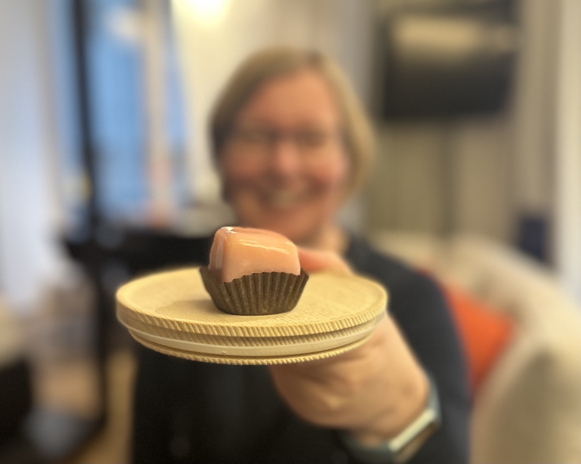 Die Crazy für you-Blechdose im Zimmer hat jetzt unsere volle Aufmerksamkeit. Neugierig schauen wir hinein und zwei verführerische rosa Punschkrapfen lachen uns an. Die dazugehörige Karte bringt es auf den Punkt: „unwiderstehliche Glücksmomente, kalorientechnisch charmant verpackt.“