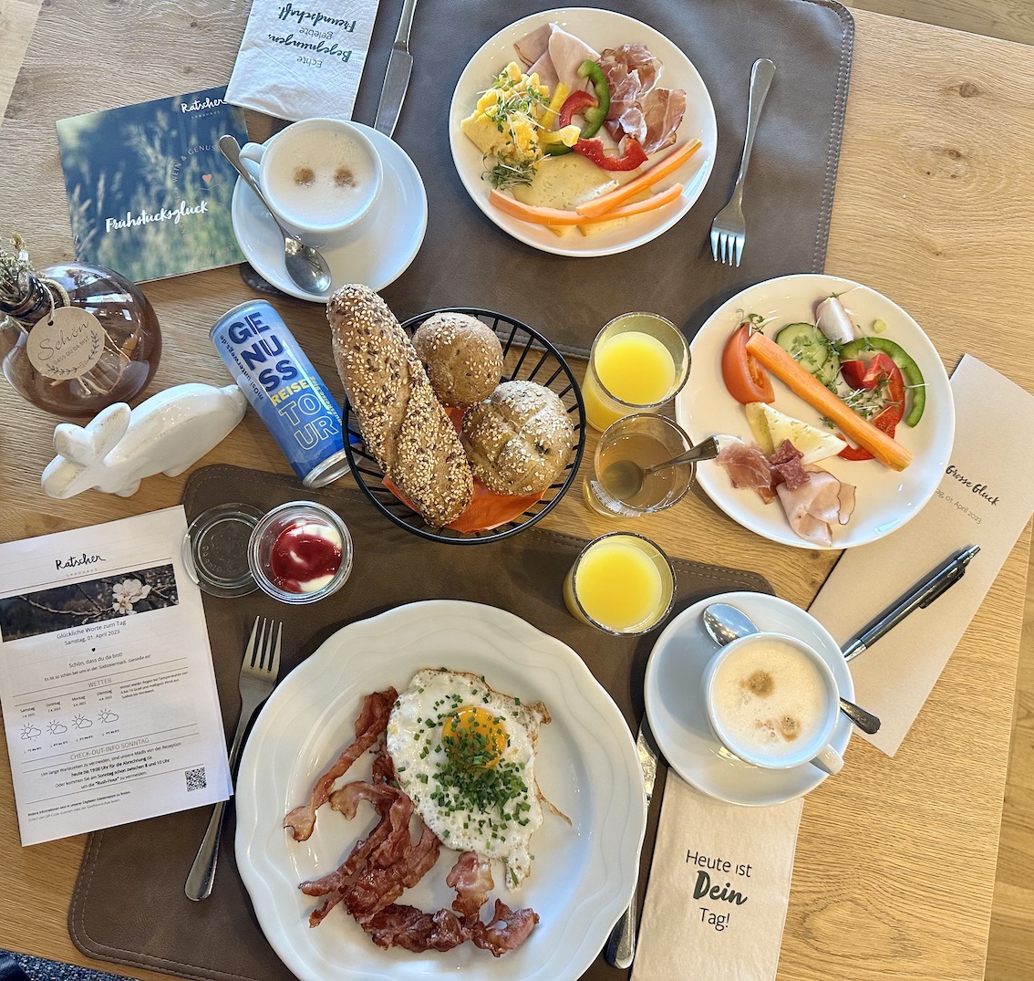 Noch vor dem Frühstück zur Stärkung des Immunsystems ein Glaserl Apfel-Essig-Drink und später zum Frühstück ein Glas Sekt aufs Haus.