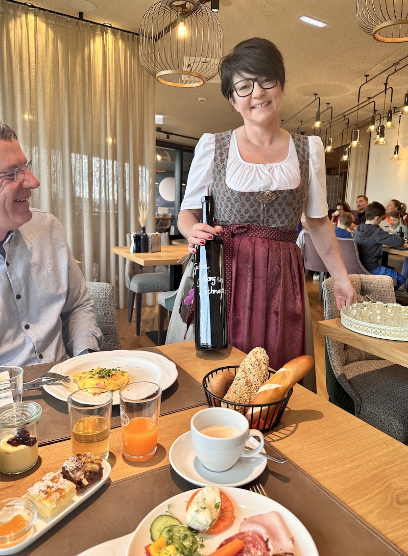 Ihr könnt aber auch einen Guten-Morgen-Schnaps genießen. Chefin Michaela macht mit der großen Flasche gerne ihre Frühstücks-Runde und gibt einen aus.