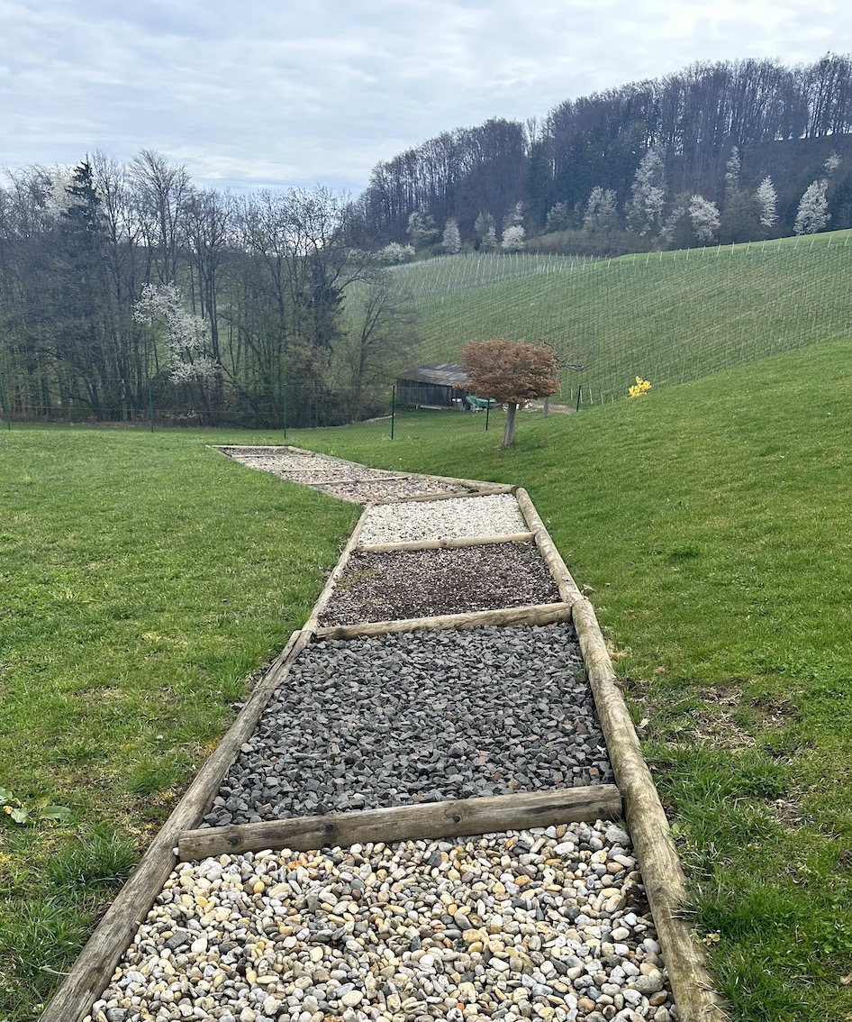 Gleich nebenan könnt ihr beim Buschenschank vom Weingut PILCH einkehren. Die Straße weiter seht ihr eines der typisch steirischen Windräder. Ein Klapotetz (abgeleitet vom slowenischen klopotec) ist eine im südsteirischen Weinland verbreitete Vogelscheuche.