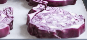- Vorbereitung des Rotkohls: Heize den Ofen auf 200 °C vor. Schneide den Rotkohl in etwa 2 cm dicke Steaks. Lege die Steaks auf ein mit Backpapier ausgelegtes Blech.