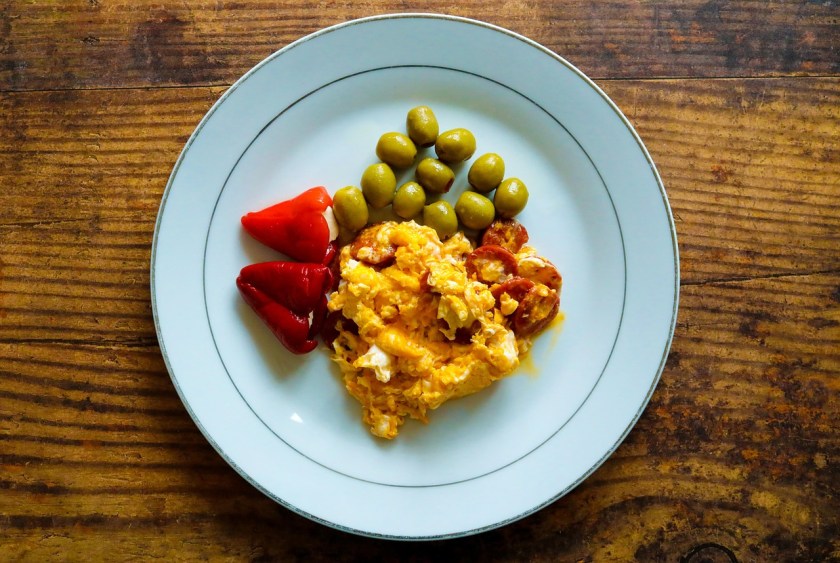 Den geriebenen Manchega-Käse über das Rührei streuen und alles bei niedriger bis mittlerer Hitze langsam stocken lassen. Dabei gelegentlich umrühren. - Servieren: